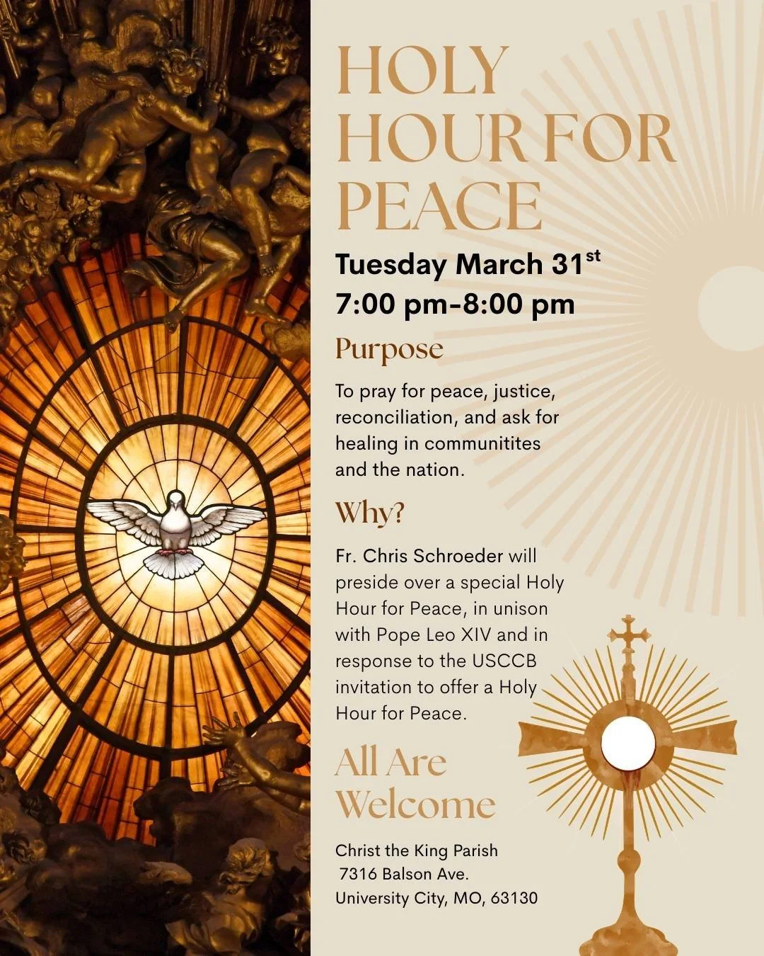 In response to his invitation, Christ the King parish is inviting all parishioners, as well as non-parishioners, as part our Holy Week observance, to a special Holy Hour for Peace on March 31, 2026 from 7:00-8:00 pm. For Archbishop Coakley’s full statement, see:
