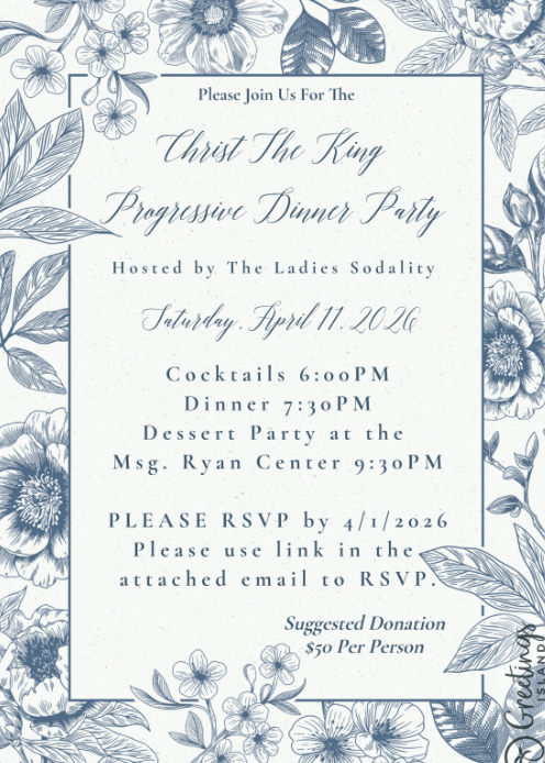 If you have not come to the Progressive Dinner before, this is a GREAT way to get to know your fellow parishioners and bring our parish family together for a night of food, fellowship and fun!